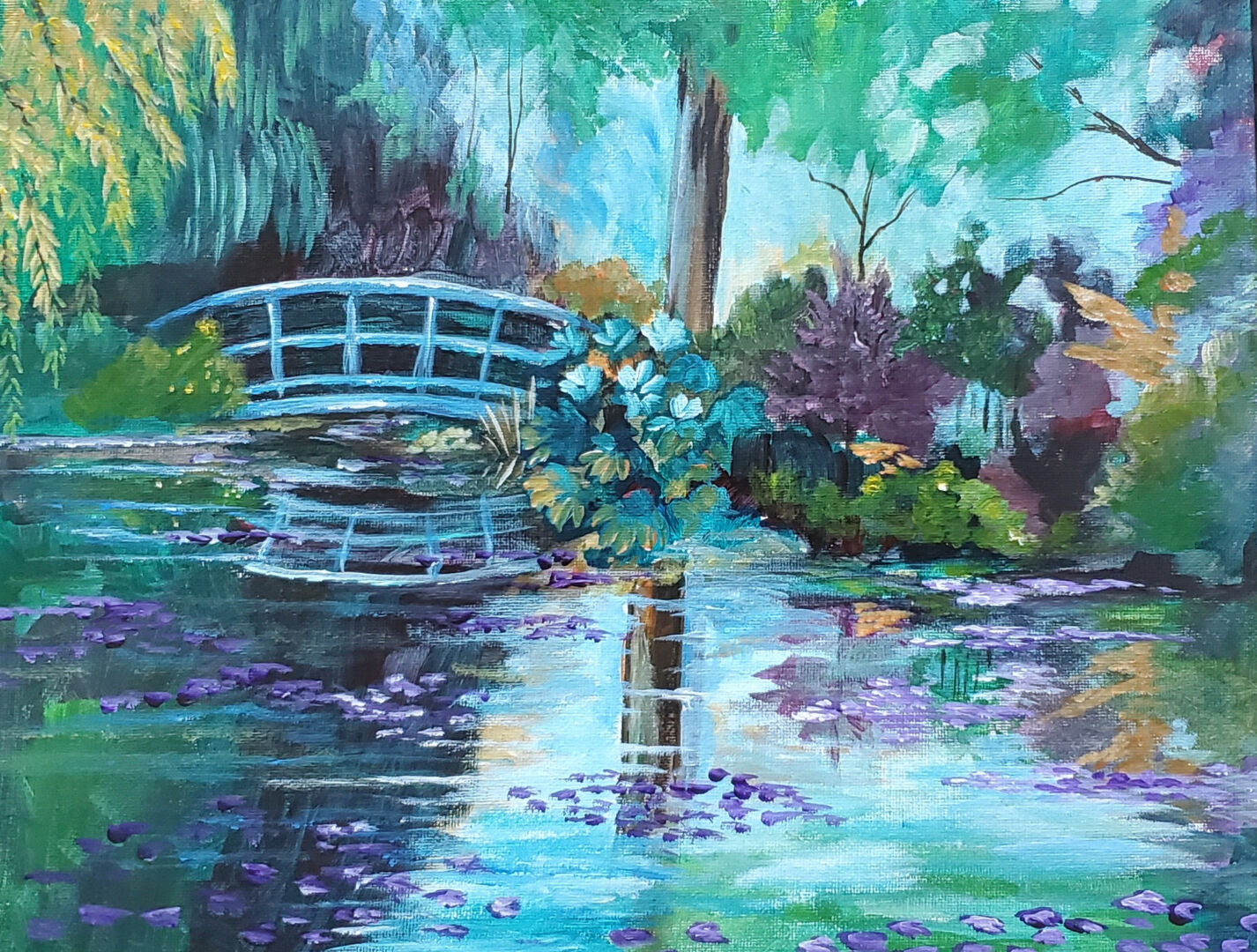 My art tends to be impressionistic and a bit experimental at times. I paint with acrylics primarily, but if I hit a “dry spell”, I will break out the watercolors, oils, pastels, or even the crafts! My studio can more more of a laboratory at times and you never know what might be on the workbench.